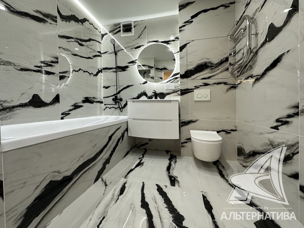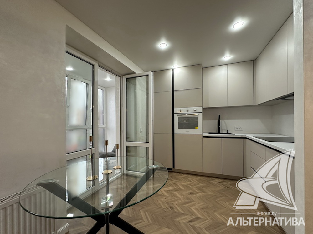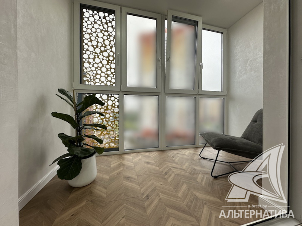 В квартире стоят двухкамерные стеклопакеты и окна во французском стиле. Межкомнатные двери выполнены из массива дерева. В «однушке» натяжные потолки, а на полу — кварцвинил.